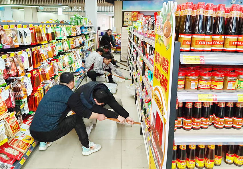 3月12日,經營管理板塊同事們齊心協力幫助民生店調整貨架,為顧客提供更舒適便捷的購物環境。