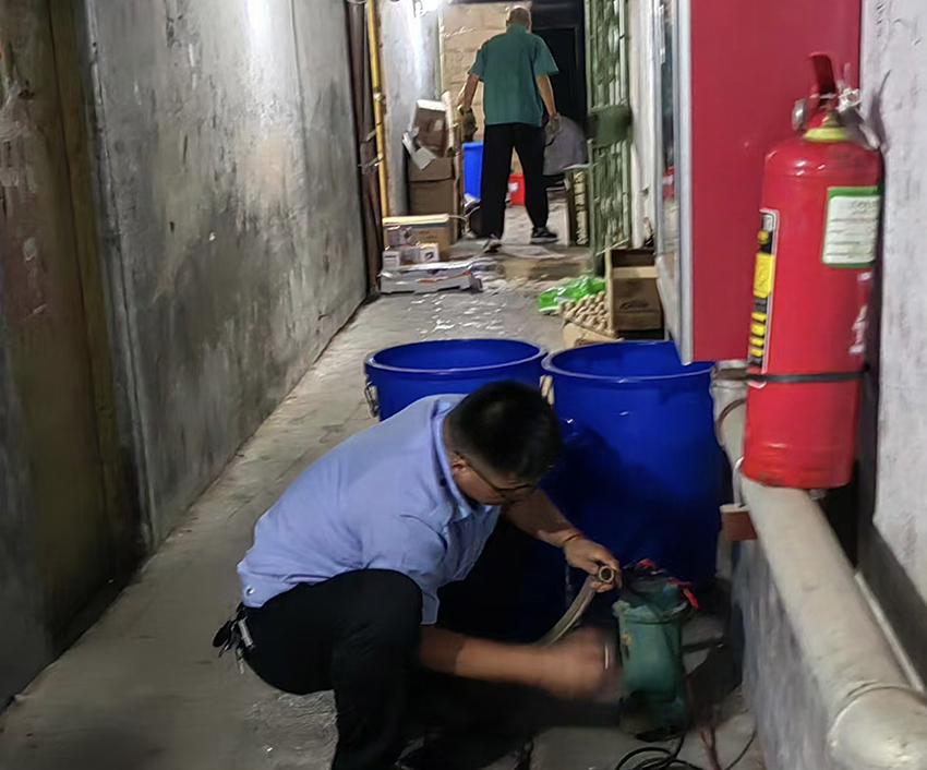 暴雨期間,安保部加強防汛檢查,發現積水后,及時攜帶抽水設備協助保潔員迅速清理,排除安全隱患。