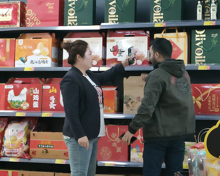 事情是這樣的,有一次,有一個(gè)外國(guó)男生站在雞蛋區(qū)那里比劃了半天,張慕華以為是問雞蛋價(jià)格,于是就拿著雞蛋用英語說了價(jià)格。結(jié)果,小男孩著急地捂著肚子,還是不停地在比劃。由于語言不通,比劃了大半天,倆人也沒溝通明白。情急之中,他拿出手機(jī)打下英語,翻譯完后,竟然是問“廁所在哪里?”。看到這句翻譯過來的話,我們都不好意思地笑了。以前,他們雖然也是超市的常客,但基本上不太和我們交流。經(jīng)過這次以后,我們雙方也算是“接上頭”了。我們也學(xué)他通過手機(jī)下載翻譯軟件,把漢語轉(zhuǎn)換成英語,便于溝通,讓他們能有更好的購(gòu)物體驗(yàn)。后來,經(jīng)過一來二去的溝通交流,我們了解到他們四個(gè)人來自孟加拉國(guó),是來求學(xué)的,住在我們民生店附近,每周三會(huì)定期來采購(gòu)大米、蔬菜、雞蛋等生活用品。因?yàn)槲疫€算是會(huì)幾句英語,所以只要他們一來,店員們就去叫我,生怕耽誤他們購(gòu)物。記得還有一次,他們要買橄欖油,我們給他們介紹了好幾種食用的橄欖油都不行,我們也有點(diǎn)不知所措,那個(gè)男生就急得不停地抹臉,看到這個(gè)動(dòng)作我們才恍然大悟,原來是擦臉用的橄欖油啊!