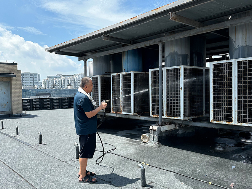 物業(yè)部陳仁生頂著烈日為民生店空調(diào)機組人工噴水降溫,確保機器運轉(zhuǎn)。