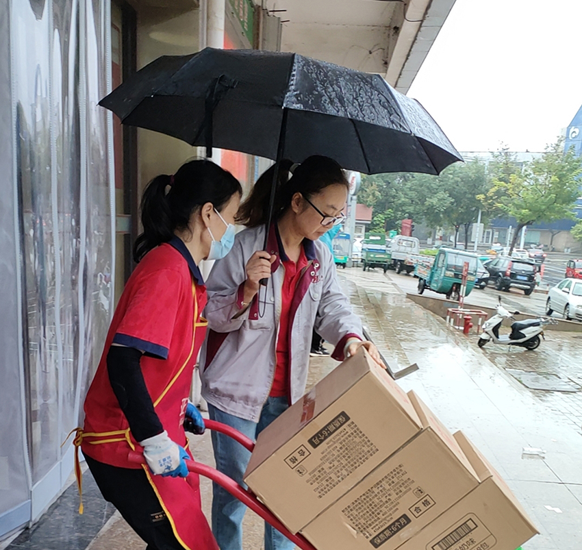 10月18日,民生店同事齊心協(xié)力、冒雨奮戰(zhàn),確保商品未濕損的同時(shí)迅速卸貨,以便后續(xù)團(tuán)購(gòu)業(yè)務(wù)及時(shí)配送。